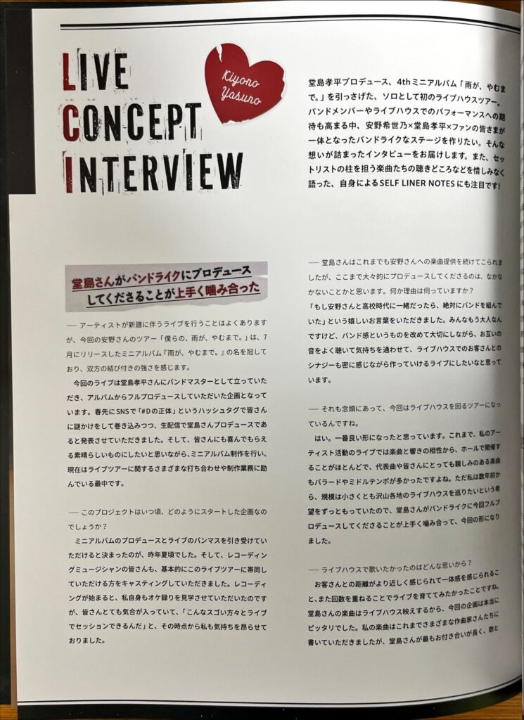 今回のライブは、ミニアルバム『雨が、やむまで。』をプロデュースしたシンガーソングライター・堂島孝平氏をバンドマスターに迎え入れたライブツアーになっています。